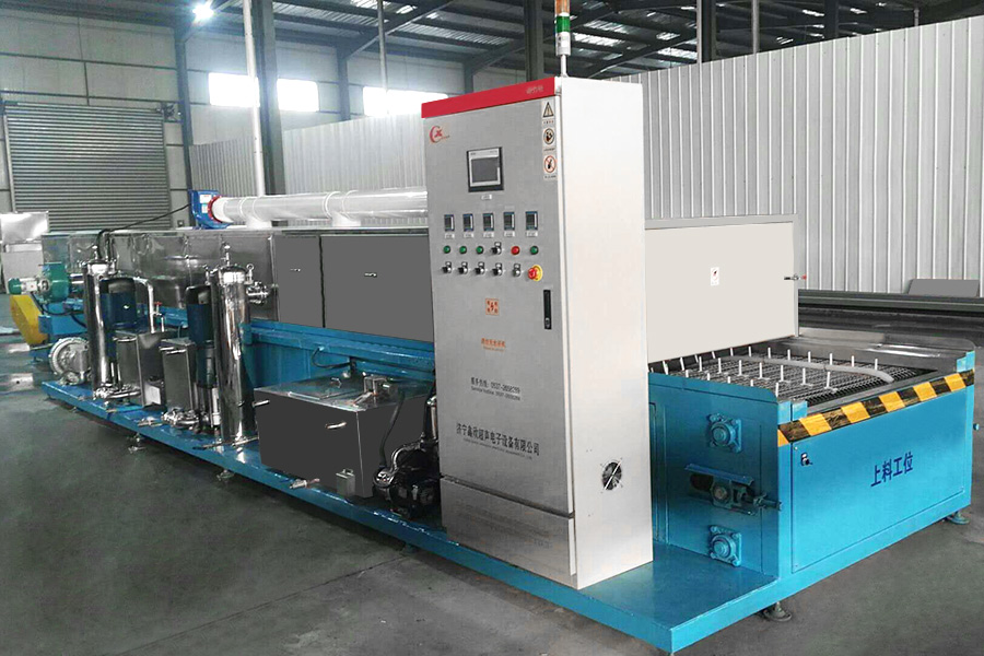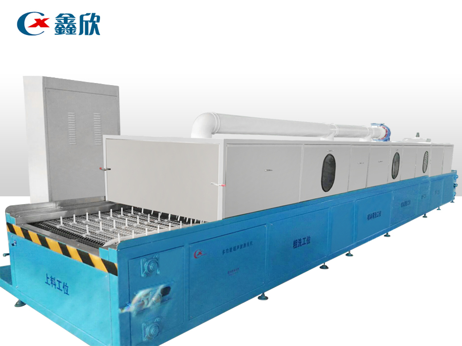 該設備有上下料網帶、超聲波清洗工位、噴淋漂洗工位、高壓風切、熱風烘干工位、溫控水加熱系統、風機、溫控空氣加熱系統、移動式風刀、PLC+觸摸屏控制系統、管路系統及智能電器控制系統等組成。自動進排液和自動加溫系統完全實現了無人干預,自動運行,很大程度上降低了工人的勞動強度。先進的霧氣處理系統可以將清洗時產生的霧氣冷凝回流,空氣經過濾和活性炭吸附后排出。