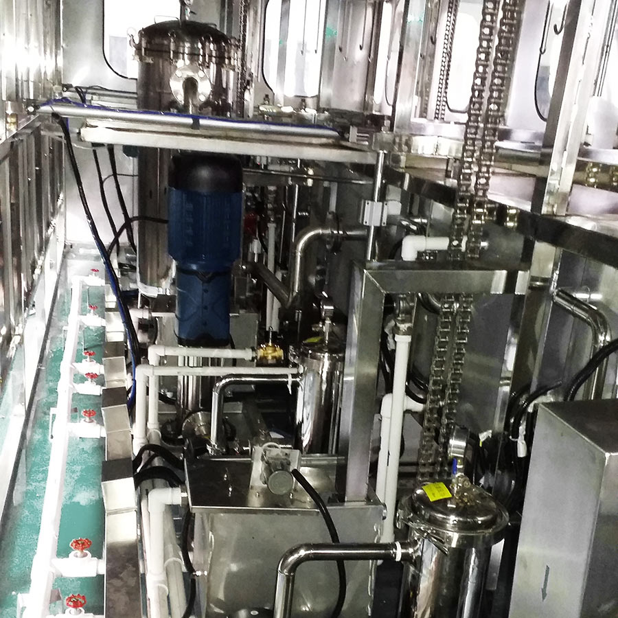 該設(shè)備有自動(dòng)上下料及轉(zhuǎn)角系統(tǒng)、超聲波清洗系統(tǒng),自動(dòng)拋動(dòng)、自動(dòng)溢流和油污分離裝置,噴淋系統(tǒng)、自動(dòng)高壓切水系統(tǒng)、自動(dòng)烘干系統(tǒng)。機(jī)械手自動(dòng)輸送系統(tǒng)采用高精度直線導(dǎo)軌配合高精度位置檢測(cè)傳感器,機(jī)械手可以準(zhǔn)確的實(shí)現(xiàn)工件的抓取和放置。自動(dòng)進(jìn)排液和自動(dòng)加溫系統(tǒng)完全實(shí)現(xiàn)了無人干預(yù),自動(dòng)運(yùn)行,很大程度上降低了工人的勞動(dòng)強(qiáng)度。先進(jìn)的霧氣處理系統(tǒng)可以將清洗時(shí)產(chǎn)生的霧氣冷凝回流,空氣經(jīng)過濾和活性炭吸附后排出。