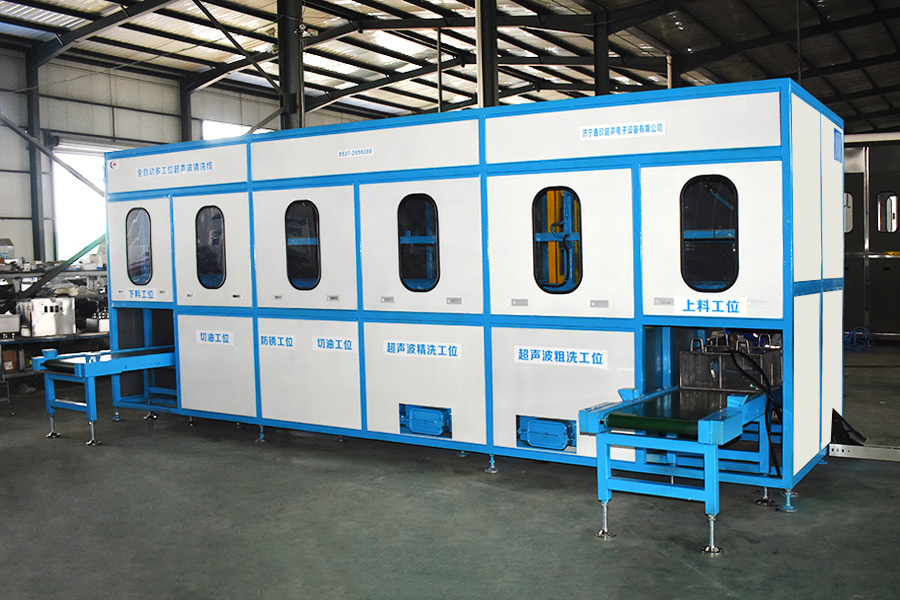 該設(shè)備有自動上下料及轉(zhuǎn)角系統(tǒng)、超聲波清洗系統(tǒng),自動拋動、自動溢流和油污分離裝置,噴淋系統(tǒng)、自動高壓切水系統(tǒng)、自動烘干系統(tǒng)。機械手自動輸送系統(tǒng)采用高精度直線導(dǎo)軌配合高精度位置檢測傳感器,機械手可以準(zhǔn)確的實現(xiàn)工件的抓取和放置。自動進(jìn)排液和自動加溫系統(tǒng)完全實現(xiàn)了無人干預(yù),自動運行,很大程度上降低了工人的勞動強度。先進(jìn)的霧氣處理系統(tǒng)可以將清洗時產(chǎn)生的霧氣冷凝回流,空氣經(jīng)過濾和活性炭吸附后排出。