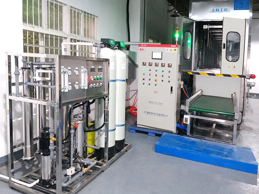該設備有自動上下料及轉角系統、超聲波清洗系統,自動拋動、自動溢流和油污分離裝置,噴淋系統、自動高壓切水系統、自動烘干系統。機械手自動輸送系統采用高精度直線導軌配合高精度位置檢測傳感器,機械手可以準確的實現工件的抓取和放置。自動進排液和自動加溫系統完全實現了無人干預,自動運行,很大程度上降低了工人的勞動強度。先進的霧氣處理系統可以將清洗時產生的霧氣冷凝回流,空氣經過濾和活性炭吸附后排出。