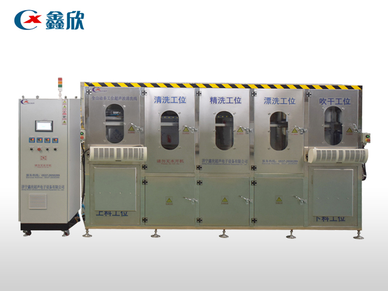 該設備有自動上下料及轉角系統、超聲波清洗系統,自動拋動、自動溢流和油污分離裝置,浸泡系統、鼓泡系統、超聲波清洗系統,下料風切系統。機械手自動輸送系統采用高精度直線導軌配合高精度位置檢測傳感器,機械手可以準確的實現工件的抓取和放置。自動進排液和自動加溫系統完全實現了無人干預,自動運行,很大程度上降低了工人的勞動強度。先進的霧氣處理系統可以將清洗時產生的霧氣冷凝回流,空氣經過濾和活性炭吸附后排出。