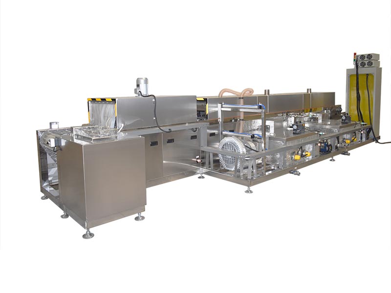 該設備有上下料網帶、超聲波清洗工位、超聲波漂洗工位、高壓風切、熱風烘干工位、溫控水加熱系統、風機、溫控空氣加熱系統、移動式風刀、PLC+觸摸屏控制系統、管路系統及智能電器控制系統等組成。自動進排液和自動加溫系統完全實現了無人干預,自動運行,很大程度上降低了工人的勞動強度。先進的霧氣處理系統可以將清洗時產生的霧氣冷凝回流,空氣經過濾和活性炭吸附后排出。