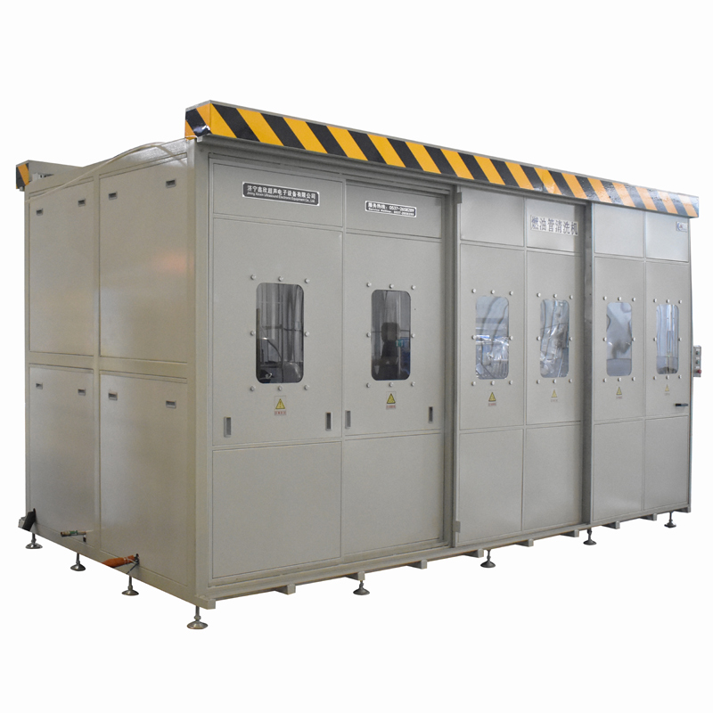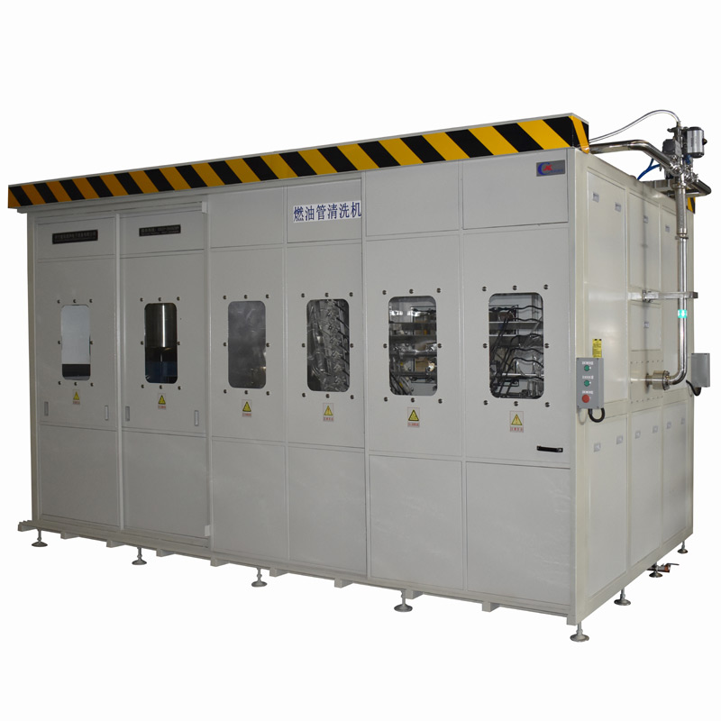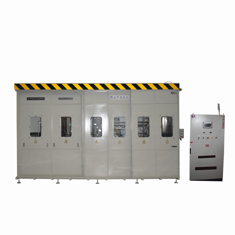 工藝流程:(01)設備安裝完畢后,人工將燃油管裝進清洗工裝中,即人工上料。→(02)上料完畢,給設備一個信號,一側翻轉至清洗吹干工位,設備外門自動關閉,設備門關閉以后設備自行對燃油管進行高壓清洗。液體采用水+清洗劑,進行清洗管件內部污物,高壓粗洗完畢的液體自動流向清洗儲液槽;→(03)高壓清洗完畢后,設備自動跳轉到高壓漂洗工位,進行漂洗管件內部污物及殘留清洗劑,高壓漂洗完畢經過壓縮空氣吹殘留液體后,漂洗完畢的液體自動流向漂洗儲液槽。→(04)高壓漂洗完畢后,設備自動跳轉至吹干工位。【清洗漂洗吹干工作時,另一側可以進行上料】→(05)吹干完畢后,設備自動打開上蓋,人工下料。