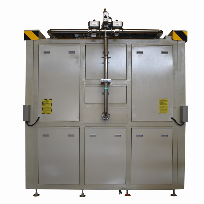 該設備為全自動高潔凈度清洗機,采用高壓沖洗工藝。整機為PLC+觸摸屏控制。該設備有兩個操作工位(其中一個上料,另一個工位清洗和下料)、一套清洗系統、一套吹干系統、過濾器×6、變頻泵×2,PLC+觸摸屏控制系統,管路系統及智能電器控制系統等組成。該機結構設計及工藝安排合理、自動化程度高、清洗精度高,有效解決了此類工件的清洗難題。